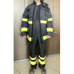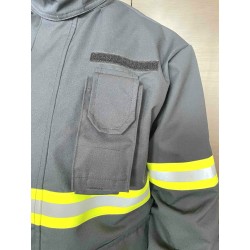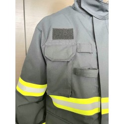 Облеклото е защитен комплект от куртка и панталон с трайно пришит етикет, който го идентифицира в съответствие с приложимите европейки норми. Изработено е от трудногорима, антистатичта тъкан, специфична площна маса: 260 g/m², цвят тъмно син.