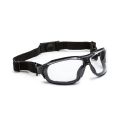 Предпазни очила EUROLUX. Извити, прозрачни поликарбонатни лещи, UV защита, покритие против запотяване N, устойчивост на високи температури, рамка от поликарбонат и TPR, и TPE дръжки с пяна и лента за глава, сваляемо уплътнение, без метал.