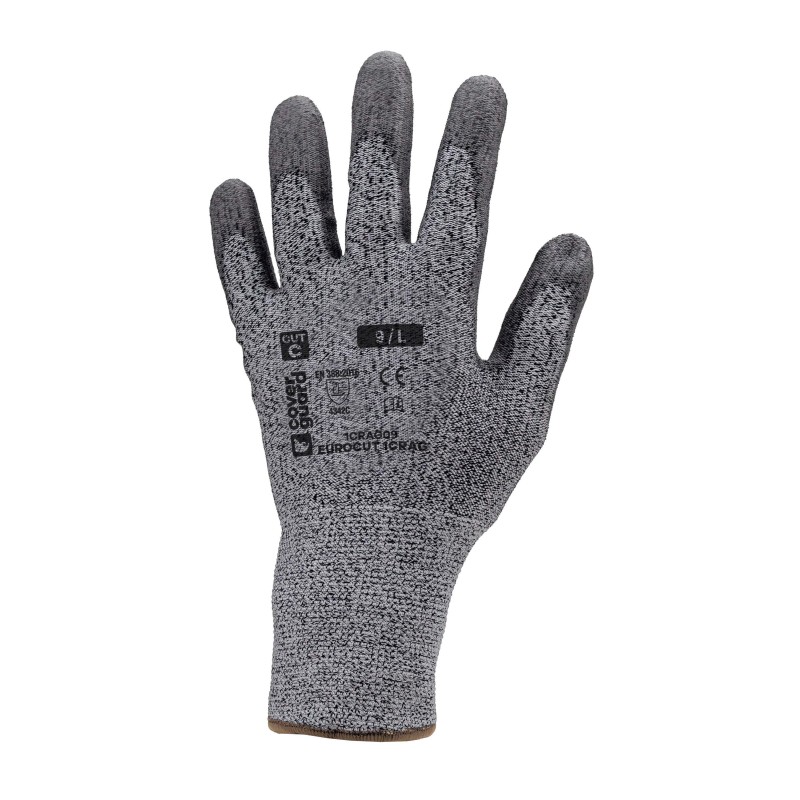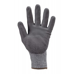 Противосрезни ръкавици, подходяши за работа в суха среда. Сива безшевна основа от HDPA и еластан; 13 файн, сиво полиуретаново покритие на дланта; трикотажен маншет. Високо ниво на сръчност. Добро съотношение цена / качество. Устойчиви на замърсяване. Добро сцепление в суха среда