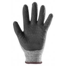 Сива безшевна трикотажна основа от устойчив рециклиран поли-памук, 10 файн, черно латексово релефно покритие на дланта, трикотажен маншет, дишащ гръб, за по -добър комфорт. Много добро сцепление във влажна среда. Големи опаковки, добра цена.