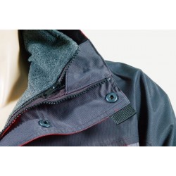 Качулка - подплатена, скрита в яката и сваляема. Отпред с вградено парче от гъвкава жица, което я прави удобна при носене. С форма на шапка. Пристягането се регулира чрез шнур и стопери. Покриващо затваряне на врата с две велкро ленти. Затваряне - двупосочен цип с два канона: един с тик-так копчета и един улей. Улеят, за предпазване от проникване на вода е скрит във вътрешния канон и позволява на водата да се отича и предотвратява проникването на вода през затварянето. Ръкави - капитонирана вата, маншет с регулиране на пристягането с велкро