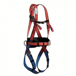 Предпазен колан за цяло тяло - опорен колан и ремък за седалището 2 точки на закрепване: 1 осигурителна стоманена халка с D-образна форма на гърба + 2 текстилни пръстена на гърдите 2 осигурителни стоманени халки с D-образна форма на опорния колан Присъединяване през гърдите: черен ремък 25 mm широк от полиестер с 1 черна катарама от пластмаса Държач за инструменти: 2 стоманени халки на колана Един размер Тегло: 1250 g